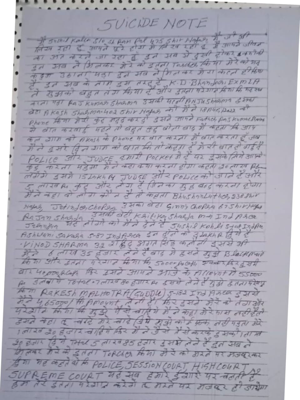 डीडी न्यूजपेपर। जालंधर के पूर्व पार्षद सुशील विकी ने आज अपनी जीवन लीला समाप्त कर ली और जाते-जाते एक सुसाइड नोट लिखे गए हैं जिसमें कई बड़े बड़े व्यक्तियों का नाम है जो उसे साइड में साफ लिखा हुआ है और प्रशासन से गुहार लगाई कि इन को कड़ी से कड़ी सजा दी जाए मैं इनसे तंग आकर अपनी जीवन लीला समाप्त कर रहा हूं पढ़े पूरा सुसाइड नोट