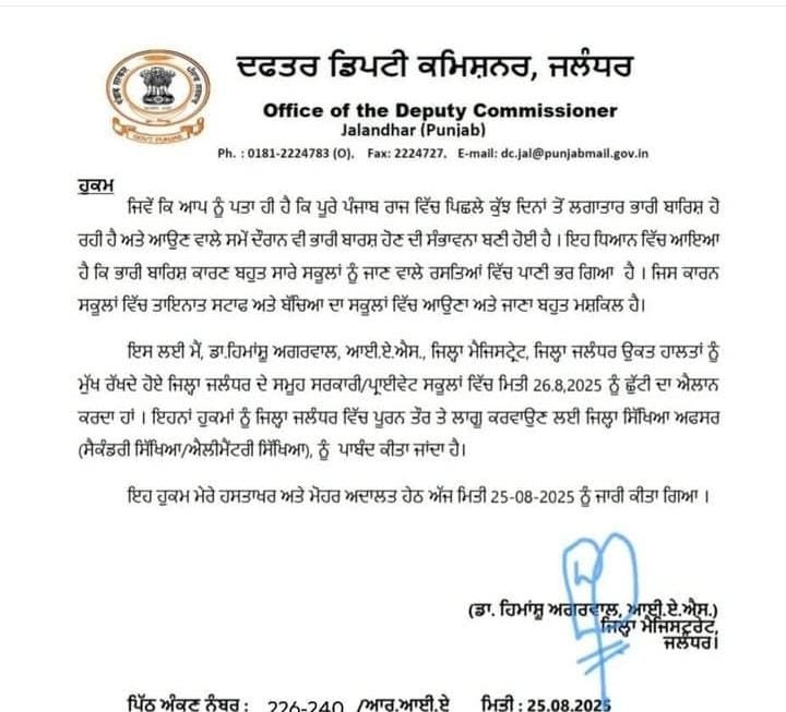 पंजाब 25/अगस्त (डीडी न्यूजपेपर) में मौसम विभाग ने 5 दिनों के अलर्ट जारी करते हुए जिलों में बहुत भारी बारिश की चेतावनी दी है मौसम विभाग 25 अगस्त से लेकर अमृतसर जालंधर पटियाला फरीदकोट नवांशहर संगरूर रूप नगर रोपड़ इन सभी शहरों में रेड अलर्ट घोषित कर दिया गया है मौसम विभाग के अनुसार 26 अगस्त को पूरे राज्य में येलो अलर्ट रहेगा और साथ में बारिश हो सकती है 27 अगस्त को केवल गुरदासपुर और पठानकोट में बारिश का असर देखने को मिलेगा जबकि राज्य के बाकी हिस्सों में मौसम सामान्य रहेगा 28 अगस्त को किसी भी जिले में चेतावनी नहीं है और मौसम साफ रहने की उम्मीद हालांकि 29 अगस्त को गुरदासपुर होशियारपुर मैं फिर से येलो अलर्ट जारी किया गया है विभाग ने लोगों को सतर्क रहने की सलाह दी है खासकर रेड अलर्ट और येलो अलर्ट वाले जिलों में लोगों को अपील किया कि बेहद जरूरी काम होने पर ही वह अपने घरों से बाहर निकले अन्यथा वे अपने घर पर ही रहे और निचले इलाकों में रहने वाले लोगों को जलबराव से बचाव के लिए पहले से ही इंतजाम करने को कहा है और शेल्टर जो कि सरकार द्वारा बनाए गए हुए हैं और बिजली गिरने के डर के कारण लोग खुले मैदान या पेड़ों के नीचे ना खड़े हो वहां से खड़े होने से बच्चे मौसम विभाग ने कहा कि आने वाले कुछ दिन पंजाब के लिए मौसम के हिसाब से चुनौती पूर्ण हो सकती है इसलिए लोगों को नियमित रूप से अपडेट पर नहीं रखनी चाहिए और सतर्क रहने की जरूरत है