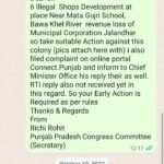 को/connect.punjab.gov.in/ ऑनलाइन से भी, म्युनिसिपल कमिश्नर देवेंद्र सिंह और ज्वाइंट कमिश्नर को भी व्हाट्सएप पर शिकायत की गई लेकिन कोई कार्रवाई नहीं हुई | आरटीआई तक का जवाब नहीं दिया नगर निगम ने, यह कैसी दोगली मानसिकता है प्रशासन की | किसके दबाव में काम कर रही है नगर निगम कमिश्नर देवेंद्र सिंह की टीम | गौर करने लायक है कि नगर निगम के दोहरे मापदंडों की शिकायत चीफ मिनिस्टर ऑफिस में भी की गई है लेकिन नगर निगम प्रशासन को किसी का डर नहीं